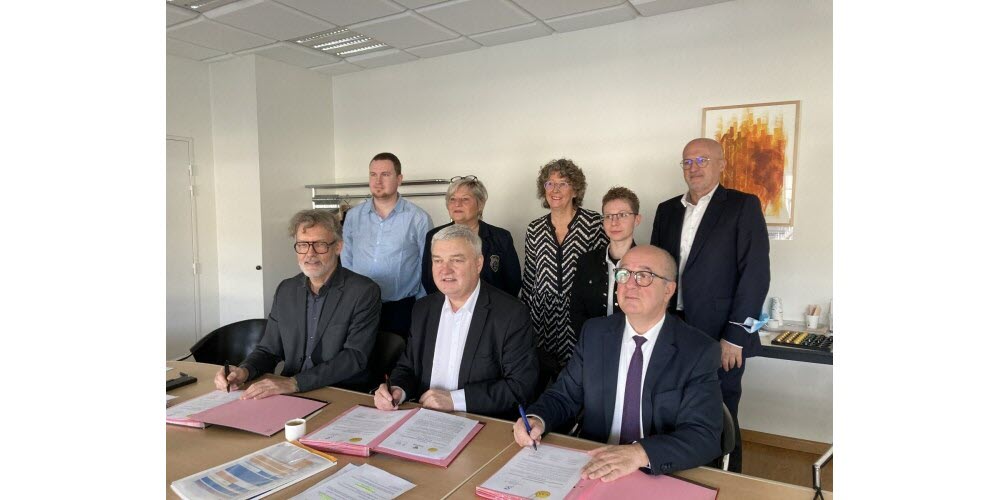 Eric STRAUMANN, président de la SCCU et de Vialis et maire de Colmar, Benoit SCHNELL, Directeur général de VIALIS et de la SCCU et Diego CALABRO, Directeur Général de la Fondation de la maison du Diaconat de Mulhouse, se sont réunis pour la signature de l'accord de raccordement de l'Hôpital Schweitzer au réseau de chauffage urbain de Colmar en 2027.